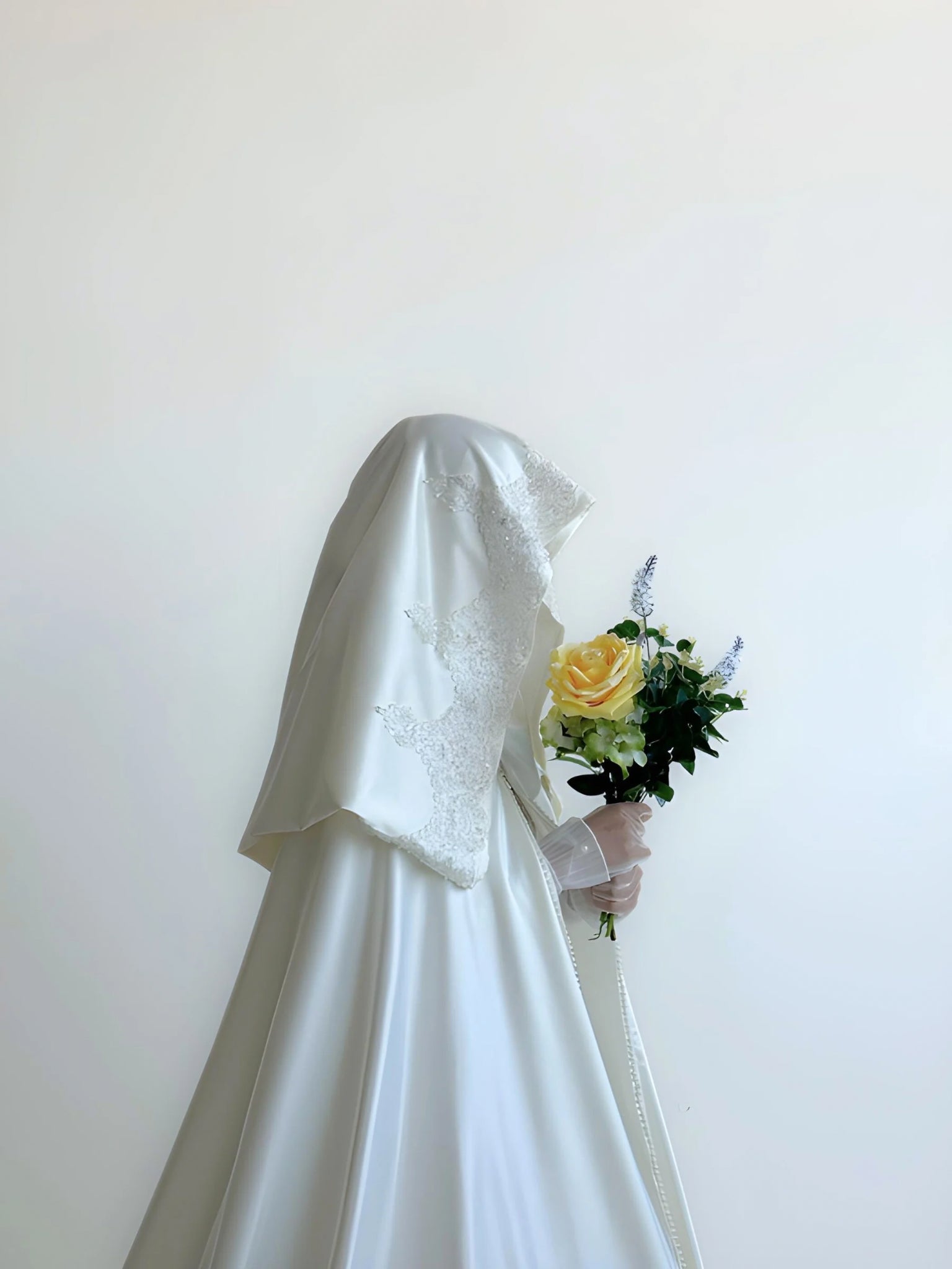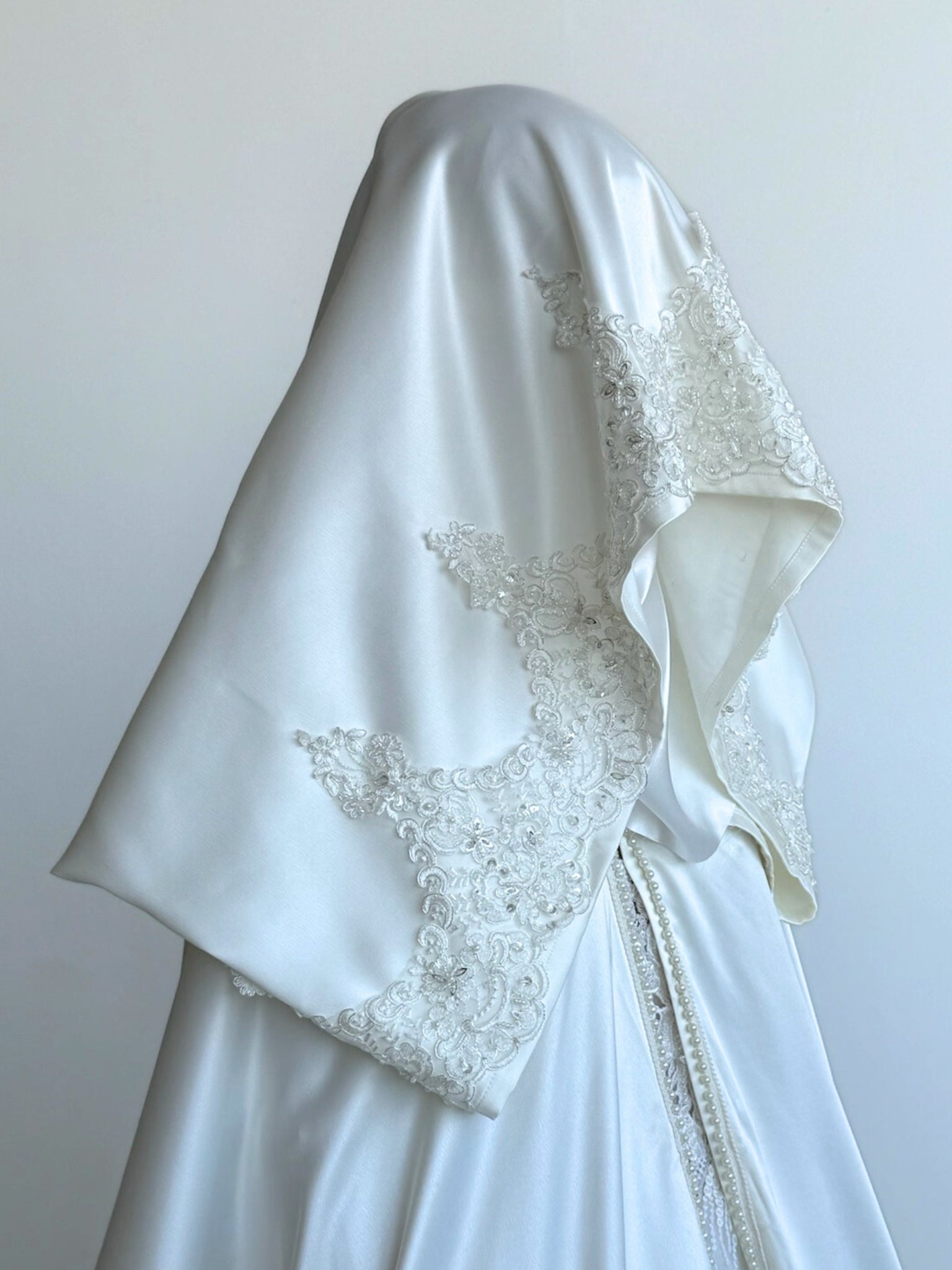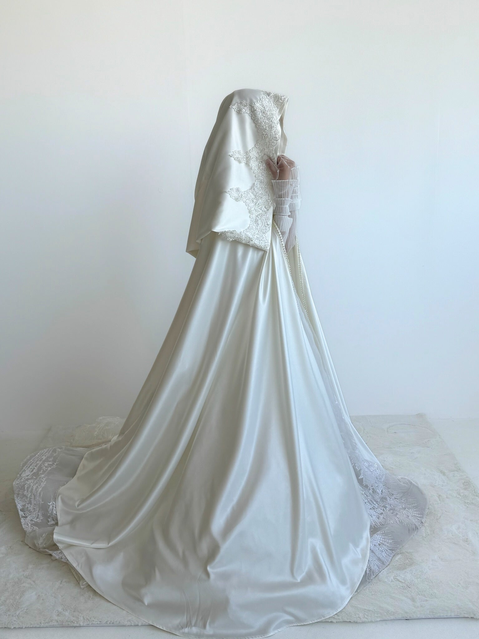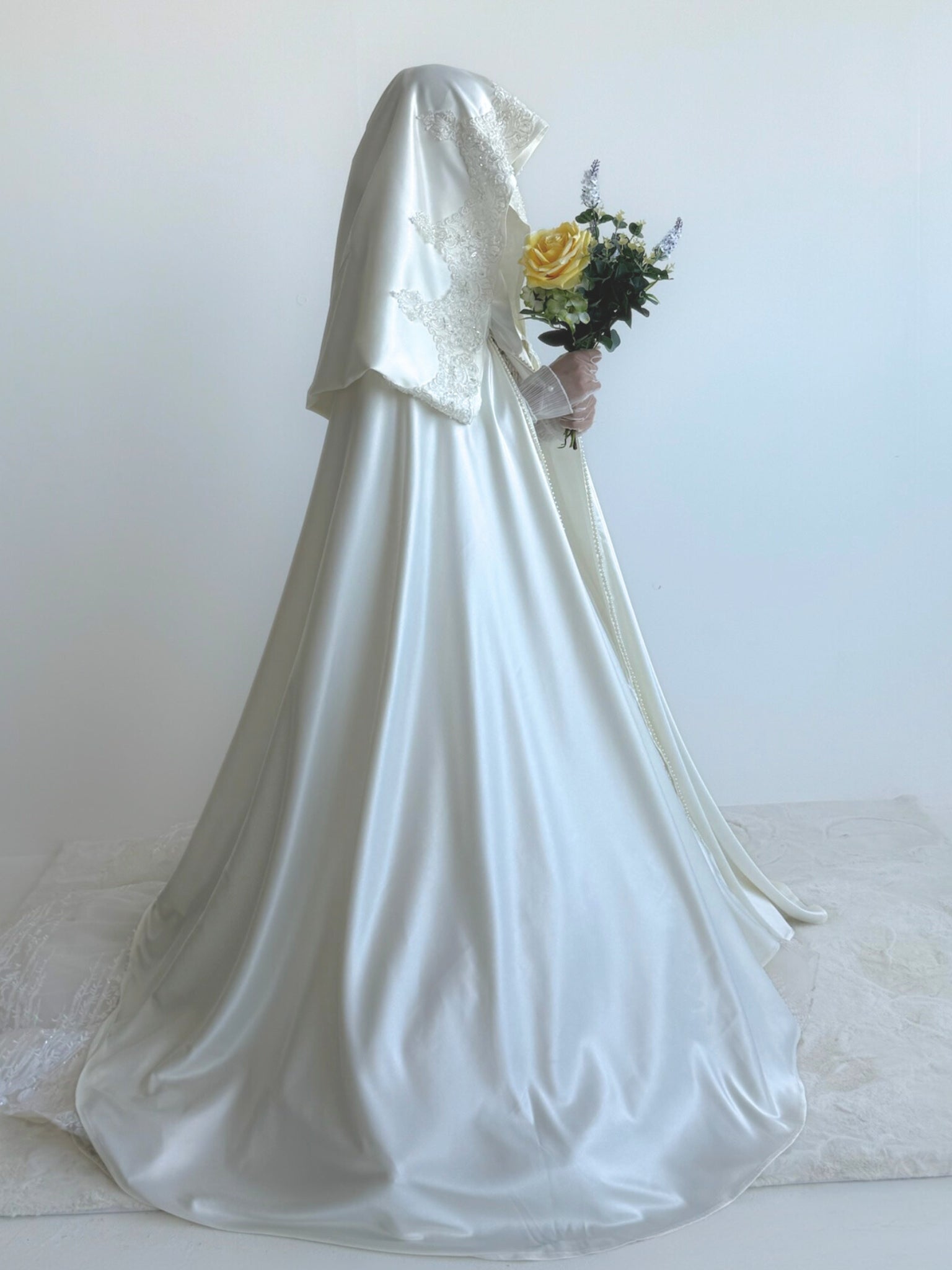 A timeless wedding cape allowing you to easily move around on your wedding day without ruining your hair and makeup by wearing hijab and niqab.