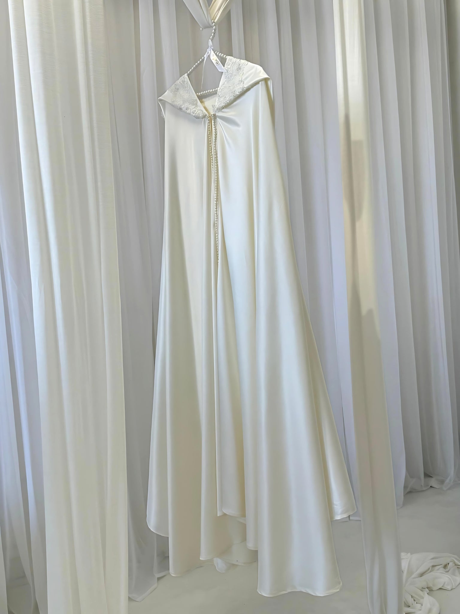 A bridal cape with an extra large hood that can be bought forward to cover your hair and face. Elegantly designed to give you the modest coverage you need outside your wedding hall while also making you feel like the precious princess you are.